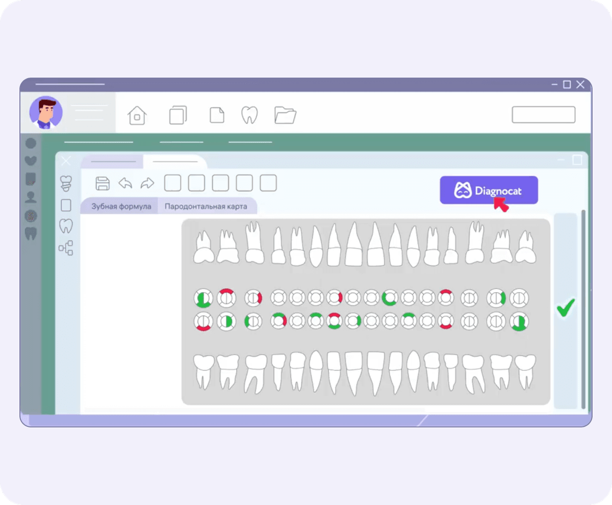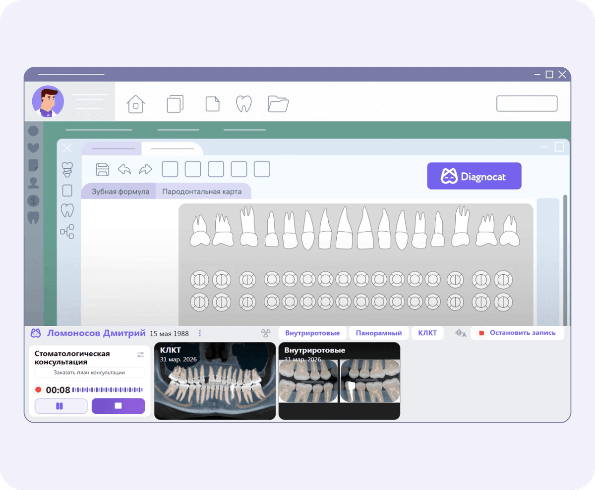 Забудьте о переключении между программами. Diagnocat 360 берет рутину на себя, высвобождая время для работы с пациентом.