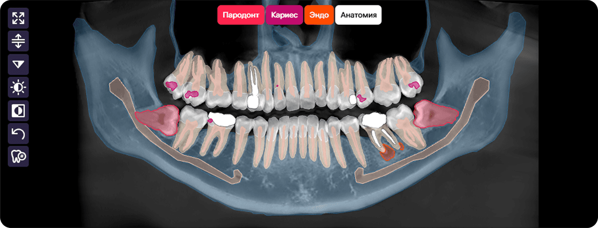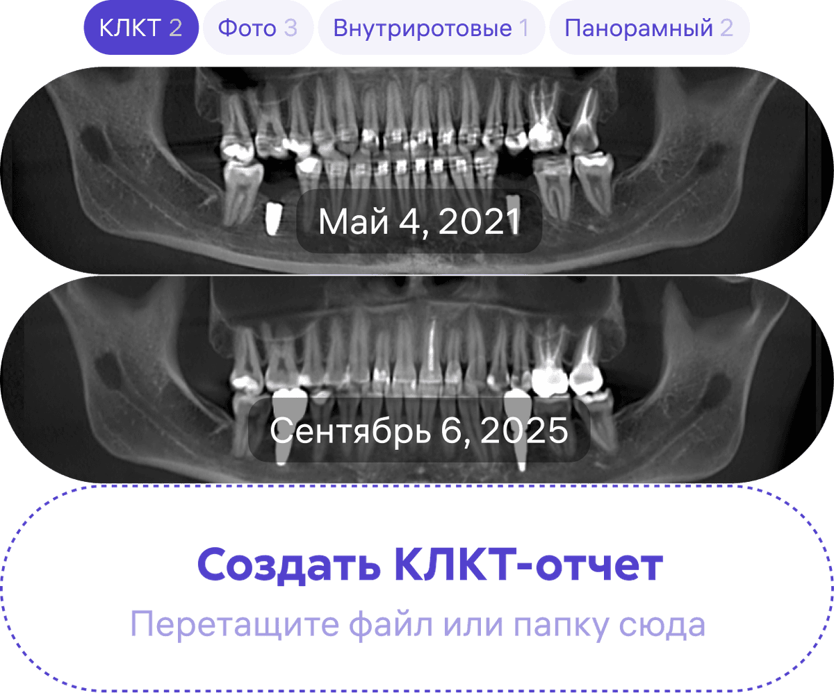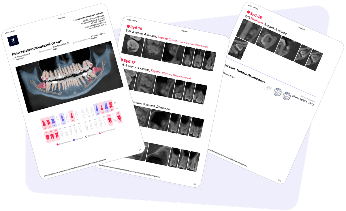 Diagnocat создает детализированные отчеты по КЛКТ, панорамным и внутриротовым снимкам. Наглядные отчеты улучшают взаимодействие с пациентами, уменьшают их тревожность и повышают мотивацию на лечение.