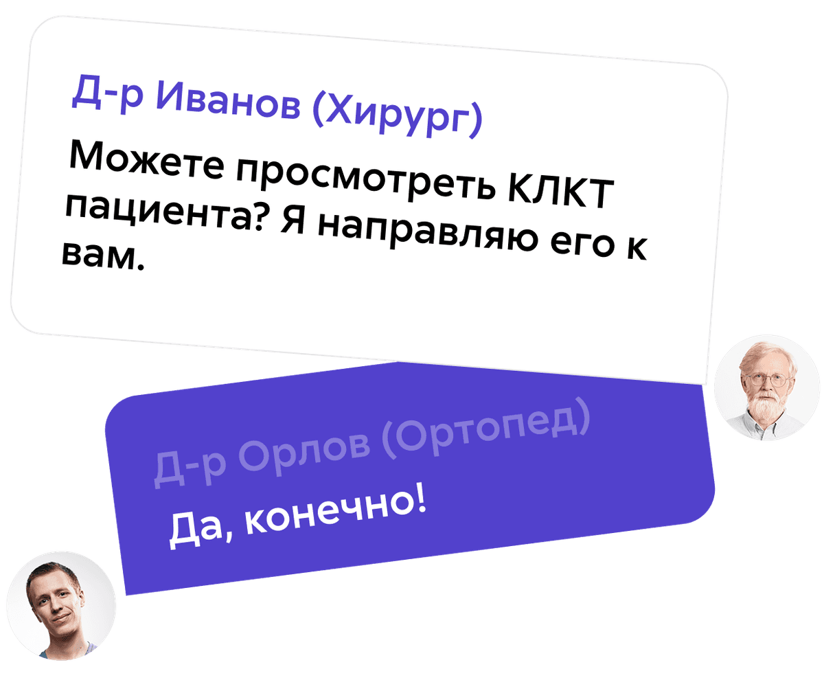 Обмен данными пациента. Упрощает взаимодействие между специалистами при обсуждении клинических случаев.